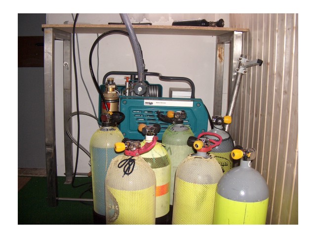 Für das Flaschenfüllen steht ein 300bar Bauer Kompressor zur Verfügung. Zur Sicherheit ist immer ein Sauerstoffkoffer und ein Defibrilator für die Freiwassertauchgänge dabei.
