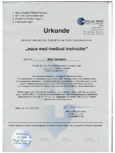Ausbildung zum aqua med Oxigen und Medical Instructor